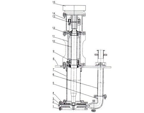 1、前蓋 2、泵體 3、葉輪 4、出水彎頭 5、排液管 7、聯(lián)接管 8、固定盤 9、軸承 10、軸 11、軸承體 12、軸承 13、聯(lián)軸器部件 14、電機(jī)架 15、電動(dòng)機(jī)