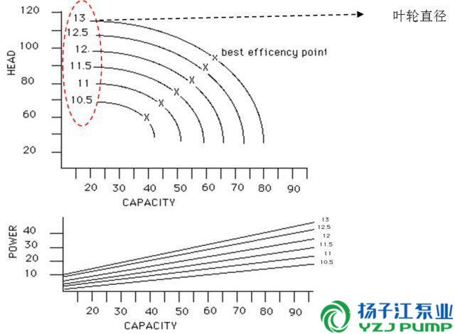 泵曲線下有對應(yīng)各類直徑葉輪的功耗值.11.5直徑的葉輪@50流量值的功耗是16