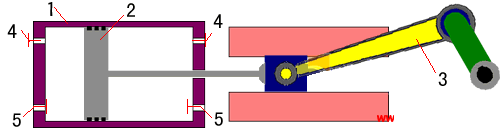 運轉(zhuǎn)時,在電動機的驅(qū)動下,通過曲柄連桿機構(gòu)的作用,使氣缸內(nèi)的活塞做往復(fù)運動。當(dāng)活塞在氣缸內(nèi)從左端向右端運動時,由于氣缸的左腔體積不斷增大,氣缸內(nèi)氣體的密度減小,而形成抽氣過程,此時被抽容器中的氣體經(jīng)過吸氣閥5進入泵體左腔。當(dāng)活塞達到右位置時,氣缸左腔內(nèi)就完全充滿了氣體。接著活塞從右端向左端運動,此時吸氣閥5關(guān)閉。氣缸內(nèi)的氣體隨站活塞從右向左運動而逐漸被壓縮,當(dāng)氣缸內(nèi)氣體的壓力達到或稍大于一個大氣壓時,排氣閥4被打開,將氣體排到大氣中,完成一個工作循環(huán)。當(dāng)活塞再左向右運動時,又重復(fù)前一循環(huán),如此反復(fù)下去,被抽容器內(nèi)終達到某一穩(wěn)定的平衡壓力。