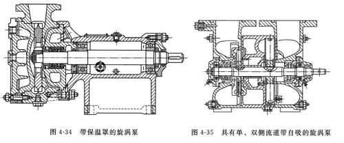 ①保溫旋渦泵 某些化學(xué)工業(yè)用泵,對輸送液體要求保持一定的溫度。否則液體可能揮發(fā)、結(jié)晶、凝結(jié)或產(chǎn)生化學(xué)變化。因此,通常是在泵過流部件的外圍加保溫罩,在其間通過具有一定溫度的液體,以達(dá)到保溫的目的。圖4—3 4所示為帶保溫罩旋渦泵的結(jié)構(gòu)。