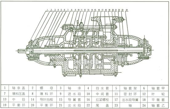 D型水泵主要零件有:進水段、中段、出水段、葉輪、導翼擋板、出水段導翼、軸、密封環(huán)、平衡環(huán)、軸套、尾蓋及軸承體。