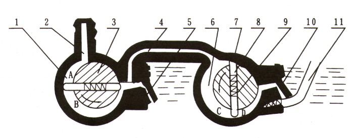 | 2X型旋片式真空泵注意: (1)真空度是指被抽容器內剩余氣體壓強,以分壓強為我廠出廠標準,總壓強為輔助標準,熱偶計測的是各種蒸汽和永久氣體的總壓強,而麥氏表只能測出永久氣體占的分壓強,故二表的數值有一定的差異。 (2)抽氣速率是根據幾何尺寸算出的在大氣壓強j時,實際抽速與幾何抽速基本相符合,在各種不同的壓強時,抽速有一定下降,抽速與壓力關系見下圖2X旋片式真空泵的性能曲線圖。 (3)溫升是指泵溫穩(wěn)定后,在排氣閥門處的油的溫度與室溫之差。 (4)2X型旋片式真空泵型號表示方法:列2X—4,2代表雙級泵,X代表旋片式真空泵,一橫線后面的數字4代表每秒鐘的抽速。 五、2X型旋片式真空泵的性能曲線圖: ![]() 六、2X型旋片式真空泵的特點: 2X型旋片式真空泵是用來對抽除密封容器氣體而獲得真空的基本設備也是目前國內使用廣泛的真空泵,有水冷和風冷兩種,本泵同國內同類產品相比具有真空度高,使用方便,安裝,維護簡單以及以下優(yōu)點: 1.2X型旋片式真空泵設有氣鎮(zhèn)閥,可抽除少量水蒸氣; 圖(1)是2X型旋片式真空泵的工作原理圖,轉子3及7與高真空室外1及低真空室6相切,轉子3及7沿箭頭方向旋轉,帶動轉子槽內滑動的轉片旋轉,由于彈簧9及離心力的作用, 轉片外端緊貼高低真空室的內表面滑動,把轉子與高低真空室所形成的月洼形空間從進氣嘴2到排氣閥門5和從過氣管4到排氣閥門10之間分隔開來,形成二或三個容積,并且周期性的大小變化,當在圖示旋片式真空泵位置繼續(xù)旋轉時A及C容積逐漸增大,被抽容積氣體沒進氣嘴進入泵內,同時B及D容積逐漸減少,壓力升高,隨后沖開排氣閥門5及10,將氣體排出真空室外,氣體經過油面而排于大氣之中,因為油是淹住排氣門的,故能防止氣體返回真空室。當抽氣壓強較高時,高低真空室的閥門都排氣,相當于單級泵,當真空度較高時,全部氣體進入真空室,再由排氣閥門10排出,此時二級串聯即進入雙級泵工作。 如被抽除的氣體中含有較高的蒸汽氣體時,在氣體受到壓縮而其蒸汽的分壓強超過此蒸汽在泵內溫度下的飽和壓強時,此時蒸氣被壓縮成為液體,旋片式真空泵無法排出,而混在真空油內,使泵的性能大大降低。如果摻入適量的空氣,使蒸汽在受到壓縮時,其分壓強也低于泵溫的飽和壓強,則蒸汽在變成液體前就能被排出泵外去,故本系列2X-4以上的旋片式真空泵都裝有能放入一定量氣體的摻氣閥11見圖(1)。 |