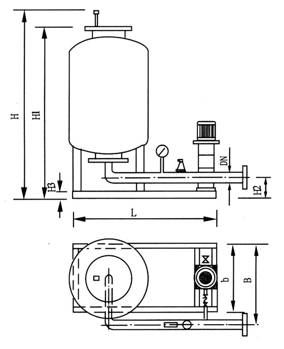 囊式膨脹定壓罐主要罐體、供水膠囊、進(jìn)(出)水口、充氣裝置、壓力表、排氣閥等組成。供水膠囊采用純天然無毒橡膠制成,具有良好的韌性和伸縮性能,它與進(jìn)水口相通,并且形成一個(gè)密閉的腔室將水與外部鋼罐內(nèi)壁完全隔絕,膠囊和鋼罐內(nèi)壁之間充有氮?dú),具有很?qiáng)的化學(xué)惰性及比熱容大等優(yōu)點(diǎn)。囊式定壓罐主要利用氣體的可壓縮性,對系統(tǒng)由于溫度變化引起的水體積增大或減少進(jìn)行吸納或補(bǔ)充作用。當(dāng)系統(tǒng)溫度增高時(shí),水體積增大,這時(shí)系統(tǒng)壓力大于罐內(nèi)氣體壓力,部分水會被壓入罐內(nèi)的膠囊里,直到罐內(nèi)氣體的壓力與系統(tǒng)壓力達(dá)到平衡。當(dāng)系統(tǒng)溫度降低時(shí),水體積變小,這時(shí)罐內(nèi)氣體壓力大于系統(tǒng)壓力,部分水會被壓回系統(tǒng),起到對系統(tǒng)補(bǔ)充水量的作用。囊式定壓罐通常與外部的控制箱,補(bǔ)水泵及電接點(diǎn)壓力表等,連接形成機(jī)組,根據(jù)系統(tǒng)的低需要壓力及高運(yùn)行工作壓力設(shè)定工作狀態(tài),性能特點(diǎn)和應(yīng)用范圍
