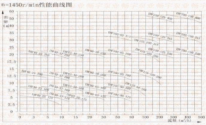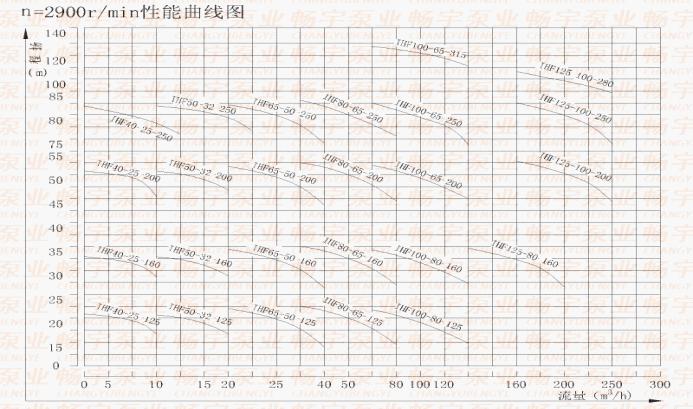 三、IHF氟塑料離心泵產(chǎn)品性能參數(shù): 型號 轉(zhuǎn)速(Rev)=2900r/min 介質(zhì)密度=1000kg/m3 轉(zhuǎn)速(Rev)=1450r/min 介質(zhì)密度=1000kg/m3 流量 揚程 電機功率kw 汽蝕余量m 效率 整機 流量 揚程 電機功率kw 汽蝕余量 效 率 整機 IHF40-25-125 4 21 1.5 2.0 40 90 2 5.5 0.55 2.0 34 80 6.3 20 3.2 5 10 18 4 3 IHF40-25-160 4 33 2.2 2.0 33 100 2 9 0.55 2.0 27 80 6.3 32 3.2 8 10 28 4 6 IHF40-25-200 4 51 4 2.0 26 140 2 13 0.75 2.0 20 80 6.3 50 3.2 12.5 10 47 4 10 IHF40-25-250 4 81 7.5 2.0 25 195 2 20.5 1.5 2.0 19 80 6.3 80 3.2 20 10 78 4 19.5 IHF50-32-125 7 22 2.2 3.0 51 105 4 5.5 0.55 3.0 45 80 12.5 20 6.3 5 15 16 8 3.5 IHF50-32-160 7 33 4 3.0 46 120 4 9 0.55 3.0 40 80 12.5 32 6.3 8 15 30 8 6 IHF50-32-200 7 51 7.5 3.0 39 170 4 13 1.1 3.0 33 92 12.5 50 6.3 12.5 15 47 8 10 IHF50-32-250 7 82 11 5.0 35 225 3.5 21 1.5 5.0 30 102 12.5 80 6.3 20 15 78 7 18 IHF65-50-125 15 22 3 3.5 62 110 8 5.5 0.55 3.5 55 80 25 20 12.5 5 35 18 15 3 IHF65-50-160 15 33 5.5 3.5 57 135 8 9 1.1 3.5 51 92 25 32 12.5 8 35 28 15 6 IHF65-40-200 15 51 11 3.5 52 210 8 13 1.5 3.5 46 110 25 50 12.5 12.5 35 45 15 10 IHF65-40-250 15 82 18.5 3.5 50 360 8 21 3 3.5 43 140 25 80 12.5 20 35 72 15 18 IHF80-65-125 35 22 5.5 4.0 69 155 16 5.5 1.1 4.0 64 110 50 20 25 5 60 18 35 3 IHF80-65-160 35 33 11 4.0 67 160 16 9 1.5 4.0 62 110 50 32 25 8 60 27 35 6 IHF80-50-200 35 52 15 4.0 63 240 16 13 2.2 4.0 57 120 50 50 25 12.5 60 45 35 10 IHF80-50-250 35 82 30 4.0 56 250 16 21 5.5 4.0 51 140 50 80 25 20 60 75 35 18 IHF100-80-125 65 22 11 4.5 77 230 35 5.5 1.5 4.5 74 130 100 20 50 5 120 18 60 3 IHF100-80-160 65 35 15 4.5 73 280 35 8.5 2.2 4.5 69 140 100 32 50 8 120 26 60 6 IHF100-65-200 65 51 30 4.5 73 420 35 13 5.5 4.5 68 320 100 50 50 12.5 120 43 60 10 IHF100-65-250 65 82 45 4.5 71 560 32.5 20.5 11 4.5 66 350 100 80 50 20 120 65 60 16.3 IHF125-100-160 100 38 30 5.0 70 440 50 10 5.5 5.0 74 300 160 32 80 8 180 26 90 6 IHF125-100-200 120 55 55 5.0 65 660 65 13 11 5.0 71 600 200 50 100 12.5 220 45 120 10 IHF125-100-250 65 21 15 5.0 72 620 100 20 120 18 IHF125-100-315 65 36 18.5 3.0 60 620 100 32 120 30 IHF150-125-250 130 22 22 7.0 67 700 200 20 240 18 IHF150-125-315 120 36 45 5.0 73 780 200 32 240 30 IHF150-125-400 120 55 75 7.0 75 920 200 50 400 46 IHF200-150-250 240 22 55 6.0 83 760 400 20 480 17 IHF200-150-315 240 36 75 7.5 75 840 400 32 480 29 IHF200-150-400 240 55 110 7.5 63 960 400 50 480 46 五、IHF氟塑料離心泵性能曲線 IHF氟塑料離心泵泵進口口徑<150mm: 1)關(guān)閉電源、進出口閥門,松開底腳螺栓;拆開防護罩將電機和泵頭聯(lián)軸器分開。 2)松開支架與泵體的連接螺栓、懸支架螺栓。可將葉輪、泵蓋、支架、軸承箱、機械密封從泵體上一并拆開。 3)松開泵軸端的緊固螺母,用銅棒敲擊螺母和拉緊螺栓,使葉輪的尾錐與泵軸上的錐套分開,葉輪、泵蓋、機械密封、支架、軸承箱各自分離。 4)松開機械密封動環(huán)的兩只緊固螺釘,可以從葉輪上退下機械密封動環(huán),在取下泵蓋,卸下泵蓋上的機械密壓蓋螺釘,可以從泵蓋上取下機械密封的靜環(huán)。 5)如需要更換泵體,則要拆下進出口管道的聯(lián)結(jié)螺栓和泵體的地腳螺栓 6)更換葉輪時,要卸下尾錐上的圓螺母。 IHF氟塑料離心泵進口口徑≥150mm: 1)關(guān)閉電源、進出口閥門,松開底腳螺栓;拆開防護罩將電機和泵頭聯(lián)軸器分開。 2)松開支架與泵體的連接螺栓、懸支架螺栓?蓪⑷~輪、泵蓋、支架、軸承箱、機械密封從泵體上一并拆開。 3)直接取下裝有機械密封動環(huán)軸套,如有銹跡難卸,可利用軸上的反螺紋圓螺母旋下軸套。 4)松開機械密封壓蓋螺栓,可取下機械密封靜環(huán):松開機械密封動環(huán)的兩只緊固螺釘,可以從軸套上退下機械密封動環(huán)。 5)更換泵體,則要拆下進出口管道的聯(lián)結(jié)螺栓和泵體的地腳螺栓。