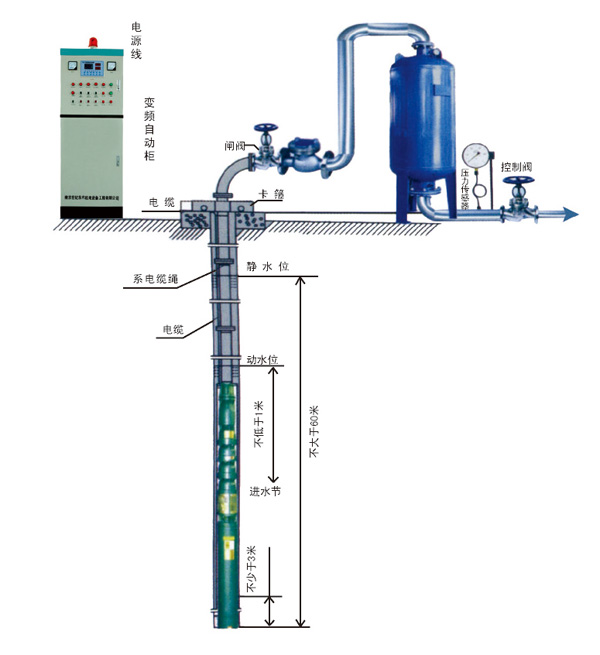 2、深井無塔變頻供水設(shè)備對(duì)井管、揚(yáng)水管無特殊要求(即:鋼管井、灰管井、土井等均可使用;在壓力許可下、鋼管、膠管、塑料管等均可作揚(yáng)水管使用)。
