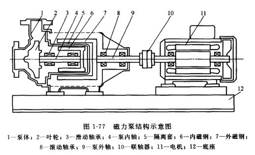 磁力傳動在離心泵上的應用與一切磁傳動原理一樣,是利用磁體能吸引鐵磁物質以及磁體或磁場之間有磁力作用的特性,而非鐵磁物質不影響或很少影響磁力的大小,因此可以無接觸地透過非磁導體(隔離套)進行動力傳輸,這種傳動裝置稱為磁性聯軸器.如圖1-77所示,磁力泵主要由泵體、葉輪、內磁鋼、外磁鋼、隔離套、泵內軸、泵外軸、滑動軸承、滾動軸承、聯軸器、電機、底座等組成(有些小型的磁力泵,將外磁鋼與電機軸直接連在一起.省去泵外軸、滾動軸承和聯軸器等部件)。電動機通過聯軸器和外磁鋼連在一起,葉輪和內磁鋼連在一起。在外磁鋼和內磁鋼之間設有全密封的隔離套,將內、外磁鋼完全隔開.使內磁鋼處于介質之中,電動機的轉軸通過磁鋼間磁極的吸力直接帶動葉輪同步轉動。