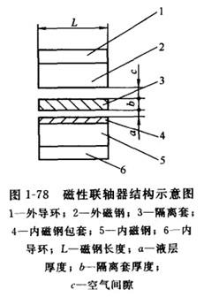 磁性聯軸器由內磁鋼(含導環(huán)和包套)、外進鋼(含導環(huán))及隔離套組成(見圖1-78),是磁力泵的核心部件。磁性聯軸器的結構、磁路設計,及其各零部件的材料關系到進力泵的可靠性,磁傳動效率及壽命。