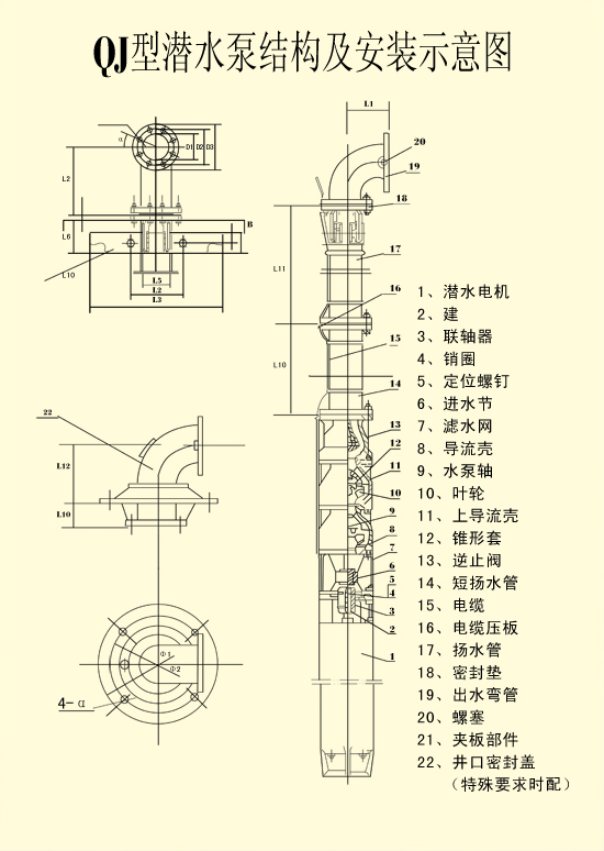 1、QJ型井用潛水泵機組由:水泵、潛水電機(包括電纜)、輸水管和控制開關(guān)四大部分組成。