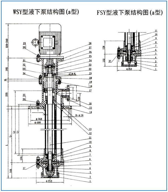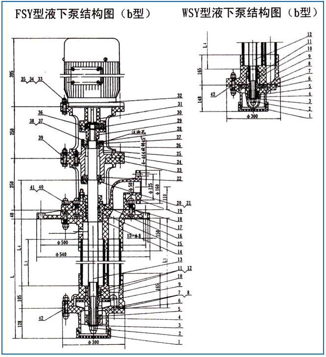WSY型、FSY型兩種型式的泵,1.WSY型泵為立式玻璃鋼液下旋渦泵。2.FSY型泵為立式玻璃鋼液下離心泵,該泵因伸入貯罐,貯槽的深度長短不同,設(shè)計液下深度800mm--3000mm之間任意選擇。只要液體高于泵體,即可不灌液而起動送液,平蓋板下設(shè)有泄漏孔,液體不會向貯罐外泄漏。